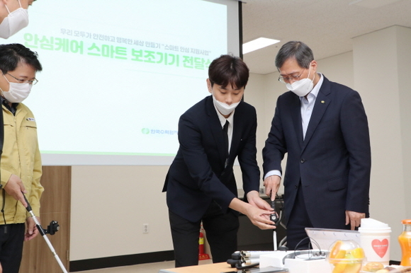 한국수력원자력(이하 한수원)이 23일 경주지역 시각·청각 장애인을 위해 ‘안심 케어’ 스마트 보조기기를 전달했다.