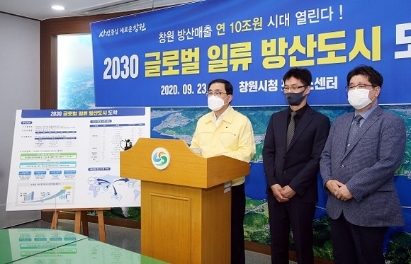 허성무 창원시장은 23일 시청프레스센터에서 코로나19 및 방산기업 지원을 위한 방산육성정책을 발표했다. 허 시장은 '2030년 글로벌 일류 방산 도시 도약' 목표는 체계 및 중소방산기업의 매출을 2030년까지 매년 10조원 달성(내수 5조원, 수출 5조원)한다는 구체적인 추진 전략과 미래상을 제시했다.