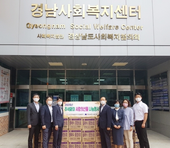 (사)우리농업지키기운동본부와 농협 경남노조 대표간부들이 지난 23일 추석 명절을 맞아 경남사회복지협의회를 방문, 목우촌 햄세트 180여 개를 전달했다. (사진=경남농협 제공)