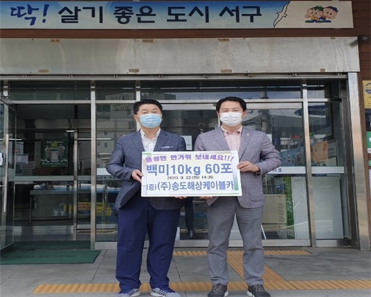 ㈜송도해상케이블카는 지난 22일 추석맞이 백미10kg 60포를 부산 서구 암남동주민센터에 전달해 관내 어려운 지역주민들이 풍성한 추석명절을 보낼 수 있도록 지원했다. (사진=부산 서구청 제공)