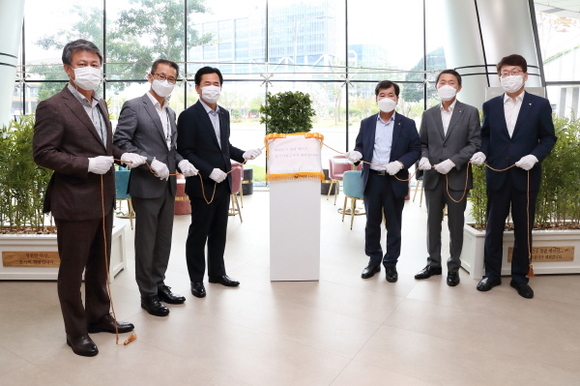 (왼쪽부터) 한국석유공사 박현규 비축사업본부장, 김경민 경원지원본부장, 양수영 사장, 윤의식 상임감사위원, 강용우 탐사생산본부장, 최창완 감사실장이 청렴라운지 현판식을 진행하고 있다. (사진=석유공사 제공)