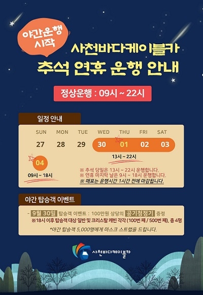 사천시시설관리공단은 추석 연휴를 맞아 사천시를 찾는 귀성객의 편의를 위해 추석 연휴 기간 동안 사천바다케이블카를 정상운행한다고 25일 밝혔다.