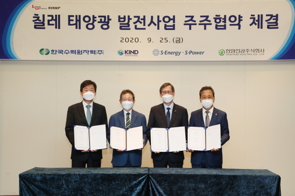 한국수력원자력(이하 한수원)은 25일 서울 코엑스에서 KIND(한국해외인프라도시개발지원공사), 에스에너지, 한양전공(주)와 칠레 태양광 발전사업 공동투자를 위한 주주협약을 체결했다.
