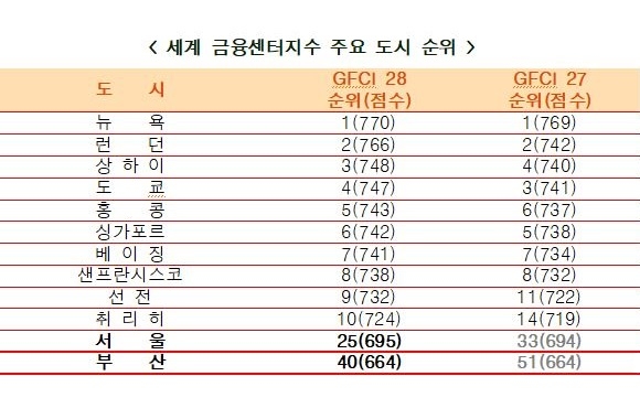 부산시의 세계 주요 금융센터지수(GFCI)가 지난 3월 세계 51위에서 40위로 11계단 대폭 상승한 것으로 확인됐다.