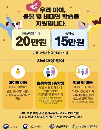이와 함께 시교육청에서는 학교 밖 아동을 포함한 초·중등 학령기 아동들에 대해 아동 돌봄과 비대면 학습을 지원하기 위한 지원금을 지급하고 있다. 초등 학령기 아동에는 1인당 20만원씩 지급되며 중학 학령기 아동에는 1인당 15만원씩 비대면 학습을 위한 지원금이 지급된다.