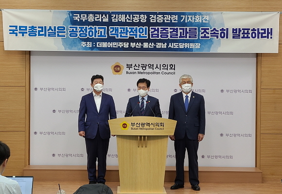 민주당 부·울·경 3개 시·도당은 28일 오전 11시 부산시의회 브리핑실에서 기자회견을 열고 총리실 신공항 전체회의에서의 불공정 논란에 대해 원인무효라고 강조하며 검증위원장을 문책하라고 촉구했다.