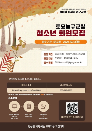 프로그램 접수기간은 오는 10월 12일까지이며, 경상권 체육·예술 교육기부 블로그에서 신청서 양식을 내려받아 온라인으로 제출하면 된다.