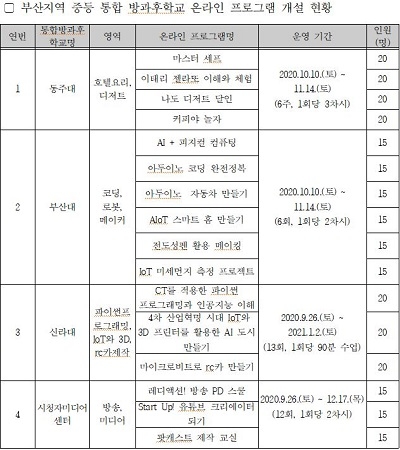 교육은 동주대, 부산대, 신라대, 부산시청자미디어센터 4개 기관을 통해 온라인으로 우선 개설됐다. 내용은 ▲부산대 ‘코딩’ ‘로봇’ ‘메이커’ ▲신라대 ‘파이썬 프로그래밍’ ‘IoT(사물인터넷)’ ‘3D’ ▲동주대 ‘호텔요리’ ‘디저트’ ▲시청자미디어센터 ‘방송’ ‘미디어’를 각각 운영하고 있다.