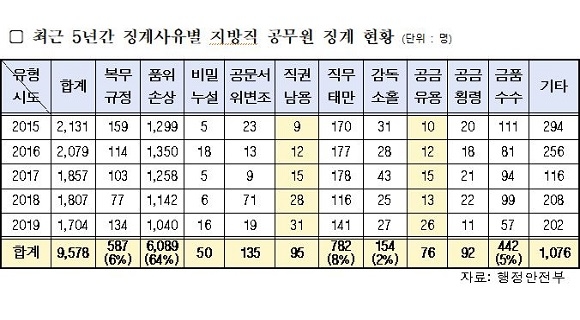 사유별로는 품위 손상으로 처벌을 받은 공무원이 64%로 가장 많았다. 이어 직무태만(8%), 복무규정 위반(6%), 금품수수(5%) 등의 징계사유가 그 뒤를 이었다.