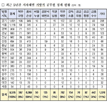 지역별로 보면 경기도가 비위행위로 인한 전체 처벌자의 17%(1631명)를 차지하며 가장 높게 나타났으며 이어 서울 1118명, 경북 909명, 경남 880명, 전남 862명 등의 순으로 집계됐다.