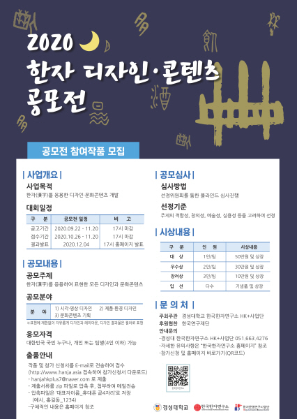 경성대학교 한국한자연구소 HK+사업단(한자문명연구사업단)이 오는 26일부터 ‘2020 한자 디자인·콘텐츠 공모전’을 개최한다.
