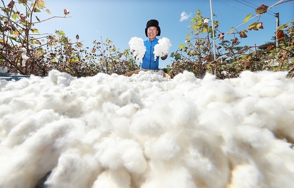 올가을 들어 가장 차가운 날씨를 보인 5일 경남 함양군 지곡면 개평한옥마을 목화밭에서 임채장 씨가 보송보송한 목화솜을 수확하고 있다. (사진=함양군 제공)