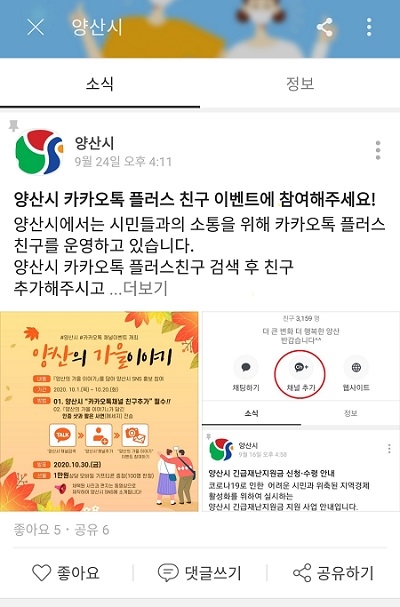 양산시 카카오톡 플러스친구는 시와 양방향 소통을 할 수 있는 채널로 단순 생활민원에 대해 실시간 답변을 받을 수 있다. 시는 내년에 이 채널을 더욱 강화하여 양산시 주요 소식을 받아볼 수 있도록 할 예정이다.