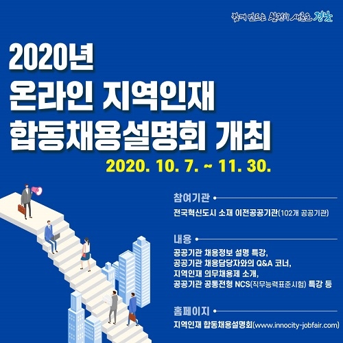 하지만 하반기에도 코로나19가 진정되지 않자 국토교통부는 경남도를 비롯한 전국 혁신도시 소재 시․도와 협의해, 지역인재 합동채용설명회를 온라인으로 개최하기로 결정했다.