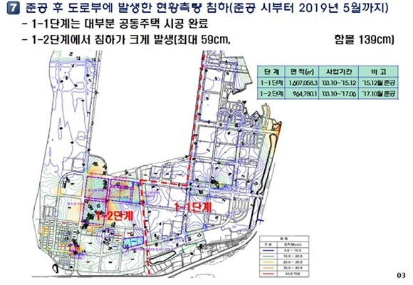 그러나 일부 침하 사례의 경우 토목학회 검수 하에 차수벽을 두 번이나 보수했음에도 침하가 계속된 것으로 확인되며 지반 자체의 안전성에 대한 확인이 추가로 요구됐다.