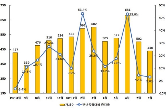 부산상공회의소(부산상의)는 ‘2020년도 8월 중 부산지역 신설법인 현황자료’를 7일 발표하고 지난 8월 한 달 동안 신설법인의 수는 440개체로 전월대비 12.4% 감소했다고 설명했다.