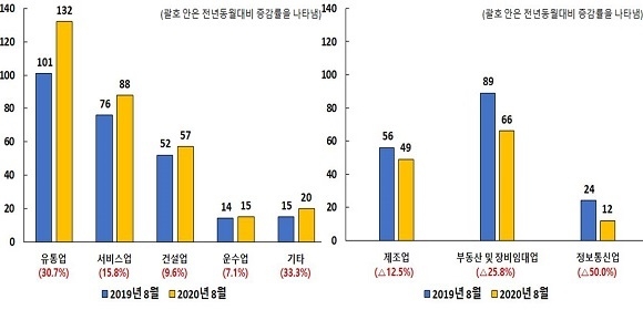 업종별 비중을 보면 유통업이 132개체(30.7%)로 가장 큰 비중을 차지했다. 이어 서비스업 88개체(20.0%), 부동산·장비 임대업 66개체(15.0%), 건설업 57개체(13.0%), 제조업 49개체(11.1%), 정보통신업 12개체(2.7%), 수산업 1개체(0.2%), 기타 20개체(4.5%) 순이다.