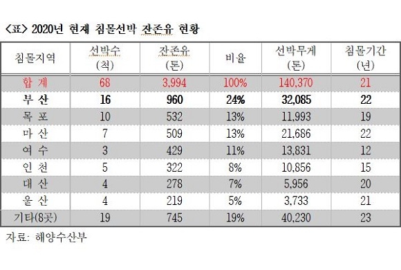 최인호 국회의원(부산 사하갑, 더불어민주당)은 해양수산부(해수부)로부터 받은 자료를 분석해 고위험 침몰 선박 68척에 국내 연안 잔존유 3994톤으로 확인했다고 8일 밝혔다. 그 가운데 화물선이 58척에 3625톤으로 전체 잔존유의 91%를 차지했다.
