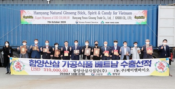 함양군에 따르면 농업회사법인 함양산삼사업단(주)은 지난 7일 함양산양삼 6차산업 클러스터센터에서 함양산양삼 가공식품을 베트남으로 수출하는 선적식을 가졌다.