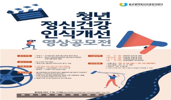 울산시는 울산광역정신건강복지센터(센터장 김경승)가 학업 및 취업 등의 스트레스로 인해 취약해진 청년들의 정신건강 관리의 중요성과 사회적 관심 증진을 위한 ‘청년 정신건강 인식개선 영상공모전’을 개최한다고 12일 밝혔다.