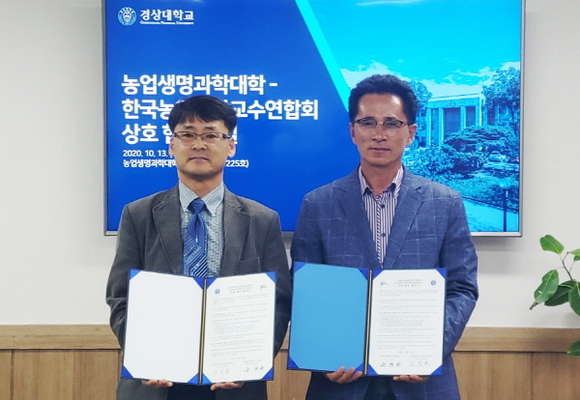 국립 경상대학교(GNU) 농업생명과학대학과 (사)한국농업현장교수연합회가 13일 오전 농업생명과학대학 학장실에서 ‘지역 농업발전 및 농산업인력 육성을 위한 상호 협약’을 체결했다.