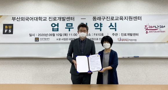 부산외국어대학교 진로개발센터는 지난달 10일 동래구진로교육지원센터와 진로 협력 체계 구축을 위한 상호 업무협약을 체결했다. (사진=부산외대 제공)