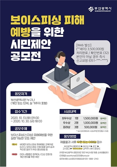 부산시가 최근 증가하고 있는 전화금융사기, 일명 '보이스피싱' 피해 예방을 위해 전 시민을 대상으로 시민 제안 공모전을 연다고 15일 밝혔다.