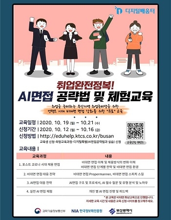 부산시가 포스트 코로나 시대에 변화하는 비대면 채용 방식에 적응이 필요할 것으로 판단해 오는 19~21일 ‘인공지능(AI) 면접 공략법과 무료 체험 교육’을 운영한다고 16일 밝혔다.