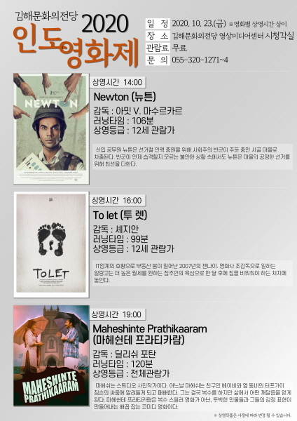 김해시-주한인도대사관과 업무협약으로 추진 중인 ‘김해의 날’ 오프라인 행사인 이번 영화제에는 발리우드 영화로 호평받는 아밋 V. 마수르카르의 ‘Newton’(뉴턴), 닐라 셰지얀 라의 ‘To let’(투 렛), 딜리쉬 포탄의 ‘마헤쉰테 프라티카람’ 총 3편의 영화가 상영된다.