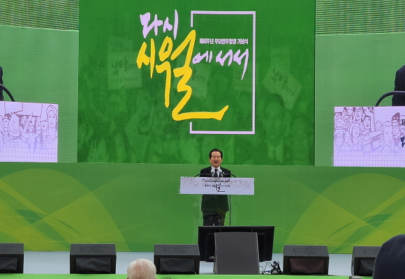 이날 정부를 대표해 참석한 정세균 총리는 “부마민주항쟁은 항쟁의 지도부도 없었으며 배후도 없었다. 오직 용기 만발한 대학생의 정의로운 외침과 순수한 시민의 자발적인 참여만이 있었다”며 “1979년 10.16 부마민주항쟁의 정의로운 씨앗이 1980년 광주 땅에 아프게 흩뿌려지고 1987년 6.10 항쟁에서 뜨겁게 마무리됐으며 오늘날 광화문 촛불로 다시금 찬란히 피었다. 정부는 부마민주항쟁 진상규명과 피해자 명예 회복, 배상을 위한 인력을 충분히 확보해 진상 보고서가 나오도록 하고 부산의 부마민주공원 기록관과 창원 민주주의전당을 속히 건립하도록 지원하겠다”고 약속했다.