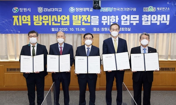 경남 창원시는 15일 시정회의실에서 경남대학교, 창원대학교, 한국전기연구원, 재료연구소와 '지역 방위산업 발전을 위한 업무협약'을 체결했다고 밝혔다.