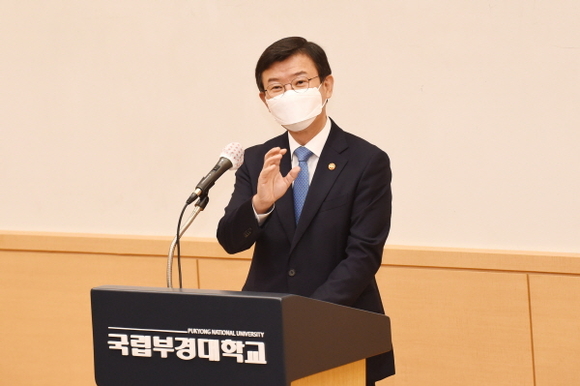 문성혁 해양수산부 장관이 16일 오후 부산 남구 부경대학교 용당캠퍼스를 방문, 유엔 FAO 세계수산대학(World Fisheries University) 공동시범사업 현장을 둘러봤다.