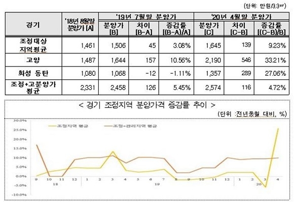 반면 같은 기간 경기도 내 조정대상 지역 가운데 고분양가 관리 제외 지역이었던 화성 동탄에서 분양가 상승률이 –1.11%에서 27.06%로 급등했으며 고양시도 10.56%에서 33.21%로 3배 넘게 증가했다.