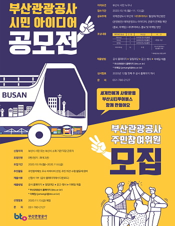 부산관광공사가 오늘(19일)부터 내달 13일까지 부산시티투어버스의 운영 활성화를 위한 시민 아이디어 공모전을 열고 또 내달 6일까지 주민참여위원을 신규 모집한다고 공고했다.