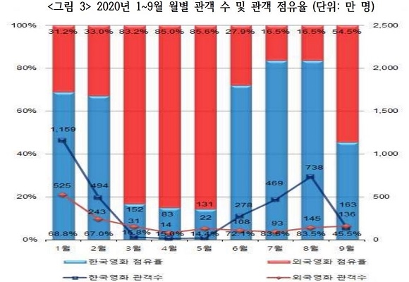 영화진흥위원회(영진위)는 20일 ‘2020년도 9월 한국 영화산업 결산’ 자료를 발표하고 한 달간 전체 관객 수가 전월대비 66.2% 감소했다고 밝혔다. 올해 1~9월과 지난해 1~9월 누적 관객 수와 비교하면 70.8% 감소한 수준이다.