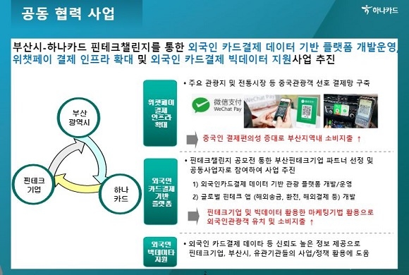 시에 따르면 이번 하나카드와의 협약은 포스트 코로나 시대를 대비한 민-관 협업사업이다. 부산 소재 유망 핀테크 기업에 다양한 협업 기회가 주어지며 외국인 관광객 소비 촉진으로 지역경제의 재도약 발판을 마련하겠다는 목표로 추진된다.