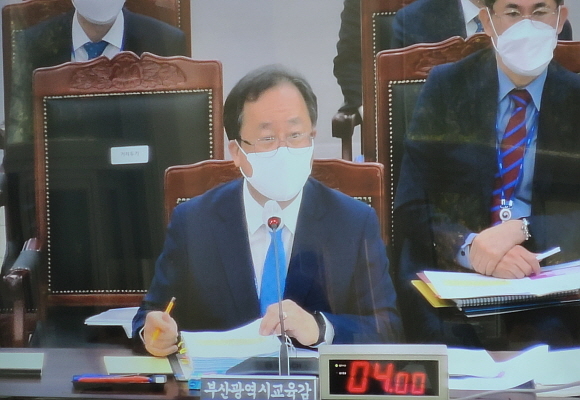 조경태 의원이 구평초 현장에 가 보았느냐 질의하자 김석준 부산시교육감은 “현장에 가보진 않았고 몇 차례 얘기가 있어 얼마 전에 교장선생님을 모시고 간담회를 했다”고 답했다.