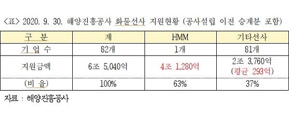 자료에 따르면 해양진흥공사는 지난달 말까지 누계 총 82개 기업에 6조 5040억원을 지원해왔다. 그 가운데 HMM 한 곳에 대한 지원금액은 4조 1280억원으로 과반인 63%의 비중을 차지하는 것으로 나타났다.