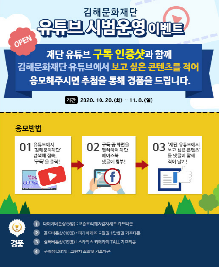 이번 시범운영을 맞아 구독 이벤트도 펼친다. 유튜브에서 김해문화재단을 검색하고 구독 버튼을 누른 후 ‘구독 중’ 화면을 캡처, 재단 유튜브에서 보고 싶은 콘텐츠를 함께 적어 김해문화재단 페이스북 페이지 이벤트 게시글에 댓글로 달면 된다. 추첨을 통해 모두 60명에게 식음료 기프티콘 등 소정의 경품을 제공한다. 기간은 이달 20일부터 오는 11월 8일까지다.
