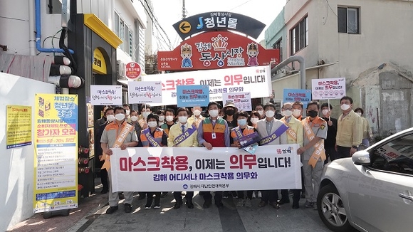 허성곤 김해시장을 비롯한 김해시 간부공무원들이 마스크 착용 의무화 홍보를 위해 거리로 나섰다.