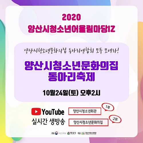 오는 24일 오후 2시 '청소년문화의집 동아리축제', 25일 오후 2시 '즐겨樂'이 유튜브 양산시청소년회관 공식 채널에서 실시간 스트리밍 방송된다.