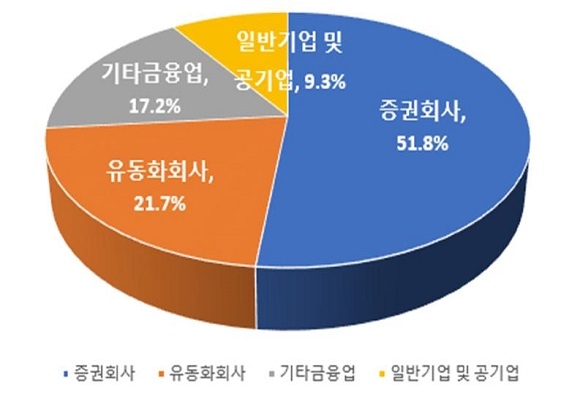 업종별로는 증권회사가 123조 5000억원으로 51.8%를 차지하며 가장 큰 비중을 차지했다. 이어 유동화회사가 51조 8000억원으로 전체의 21.7%, 카드·캐피탈 등 기타금융업은 41조원으로 17.2%, 일반기업·공기업 등에서는 22조 3000억원으로 9.3%를 차지했다.