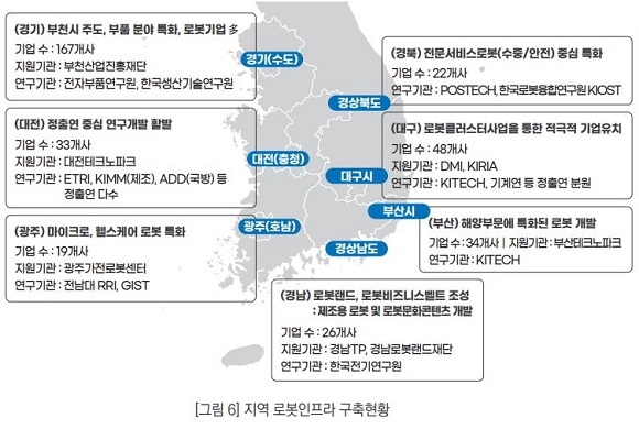 부산의 로봇기업 사업체 수는 97개사(전국 3.1%), 총매출액은 2755억원(전국 3.7%), 인력은 951명(전국 2.4%)으로 조사되며 타지역에 비해 매우 낮은 상황으로 조사됐다. 또 업종별로도 제조업용 로봇에 집중돼 있으며 연구개발 인력 비중도 낮게 파악되는 등 로봇산업의 기본적인 체질 개선이 필요한 것으로 드러났다.