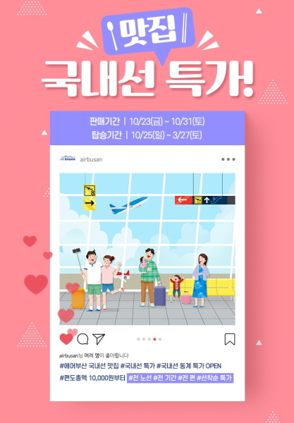 에어부산은 이달 23일 오전 11시부터 31일까지 국내 5개 노선(부산-김포, 부산-제주, 김포-제주, 울산-김포, 울산-제주)의 항공권을 편도 총액 1만원에 판매하는 특가 이벤트를 진행한다.