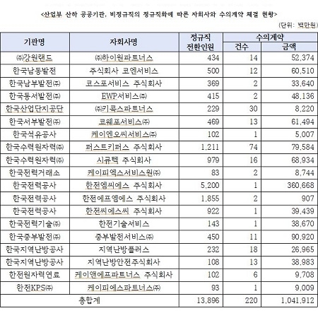 문제는 이뿐이 아니라고 이 의원은 지적했다. 산업부 산하 공기업이 비정규직의 정규직화를 위해 세운 자회사 19곳에 몰아준 수의계약이 자회사 설립 이후 총 220건에 1조 419억원 규모에 달하는 것으로 밝혀졌다.