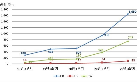종류별 행사 건수는 CB가 1650건으로 직전분기 대비 76.8%(717건), EB는 93건으로 직전분기 대비 173.5%(59건), BW는 747건으로 직전분기에 비해 97.6%(369건) 각각 늘었다.