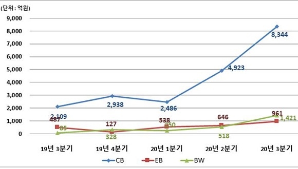 또 행사 금액은 CB가 8344억원으로 직전분기 대비 69.5%(3421억원), EB가 961억원으로 직전분기 대비 48.8%(315억원), 또 BW가 1421억원으로 직전분기에 비해 174.3%(903억원) 늘었다.