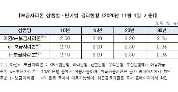 이에 주금공 홈페이지를 통해 신청하는 'u-보금자리론‘과 은행 창구에서 신청하는 ’t-보금자리론‘은 대출 만기에 따라 연 2.10%(만기 10년)에서 최대 2.35%(30년)로 이용할 수 있다.