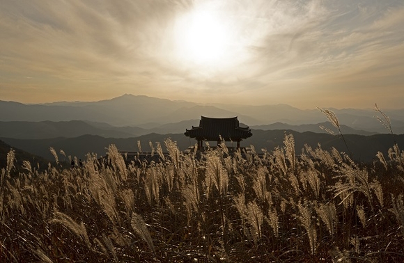 산청 황매산의 가을 진객 억새가 햇살을 받아 황금빛으로 일렁이고 있다. 산청 황매산은 최근 오토캠핑장 등으로 구성된 '미리내파크'가 들어서는 등 비대면 힐링 야외 관광지로 각광받고 있다. (사진=산청군 제공)