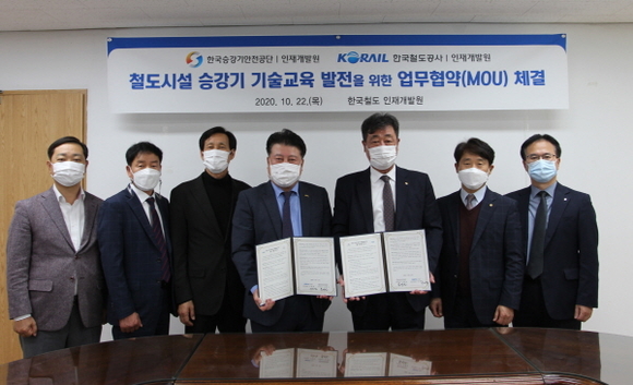 한국승강기안전공단 승강기인재개발원과 한국철도공사(코레일) 인재개발원이 지난 22일 철도시설 승강기 사고예방과 승강기 교육과정 개발 등을 위한 업무협약을 체결했다.